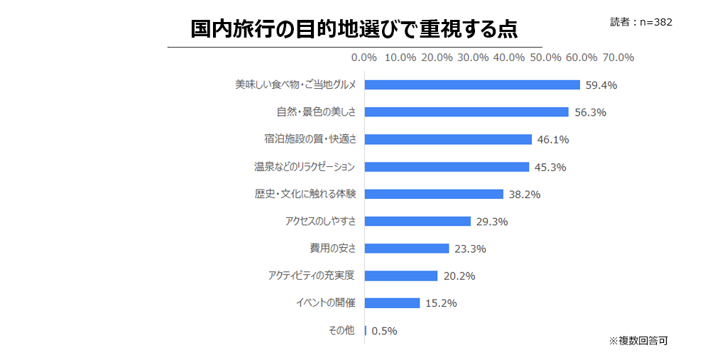 「美味しい食べ物・ご当地グルメ」(59.4%)が最も多く、次いで「自然・景色の美しさ」(56.3%)「宿泊施設の質・快適さ」(46.1%)と、旅行先で味わうことのできる経験を重視していることがわかります。