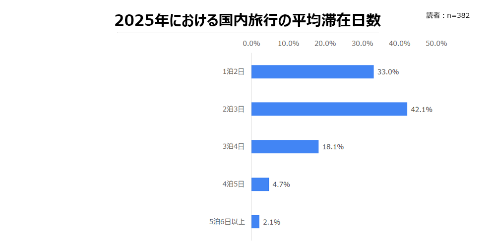 最も多い回答は「2泊3日」(42.1%)で、次いで「1泊2日」(33.0%)という結果になりました。