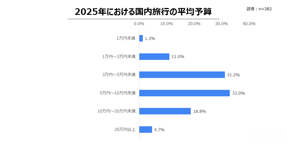 最も多い回答は、「5万~10万円未満」(33.0%)でした。1回の国内旅行当たり5万円以上の予算を設定する読者は約56.5%でした。