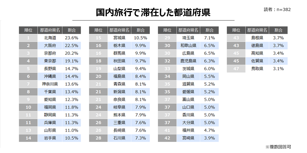 国内旅行をした読者に、「国内旅行で滞在した都道府県を教えてください」(複数回答可)と聞きました。