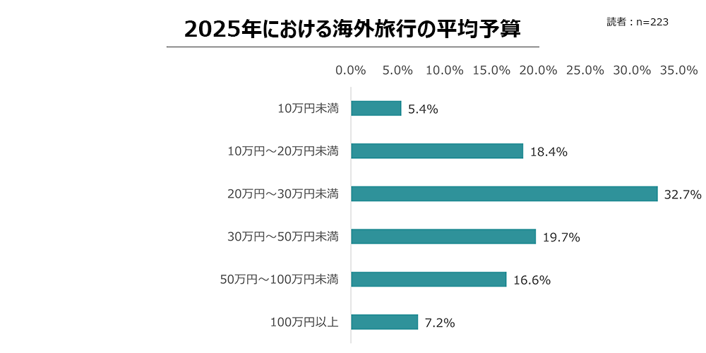 最も多い回答は、「20万~30万円未満」(32.7%)でした。1回の国内旅行当たり、50万円以上の予算を設定する読者は約2割と、移動費用含め国内に比べてより費用が大きいことがわかります。