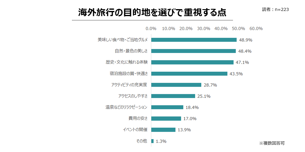 「美味しい食べ物・ご当地グルメ」(48.9%)が最も多く、次いで「自然・景色の美しさ」(48.4%)、「歴史・文化に触れる体験」(47.1%)と、旅行先での特別な体験を重視していることがわかります。