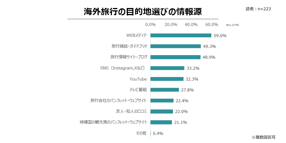 「WEBメディア」(59.6%)が最も多く、次いで「旅行雑誌・ガイドブック」(49.3%) 、「旅行情報サイト・ブログ」(48.9%)と、WEBを活用して広く情報を取りつつ、専門媒体で詳しく情報を確認する傾向にあることがわかりました。また、国内旅行の結果と比較すると、よりSNSを活用していることもわかります。