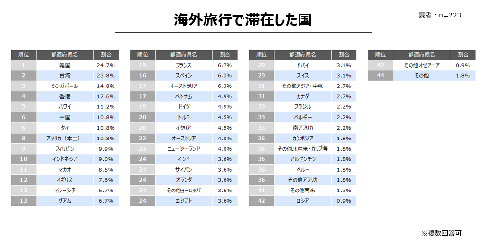 「韓国」(24.7%)が最も多く、次いで「台湾」(23.8%)、「シンガポール」(14.8%)と、読者は滞在先にアジア圏を選ぶ傾向にあることがわかりました。