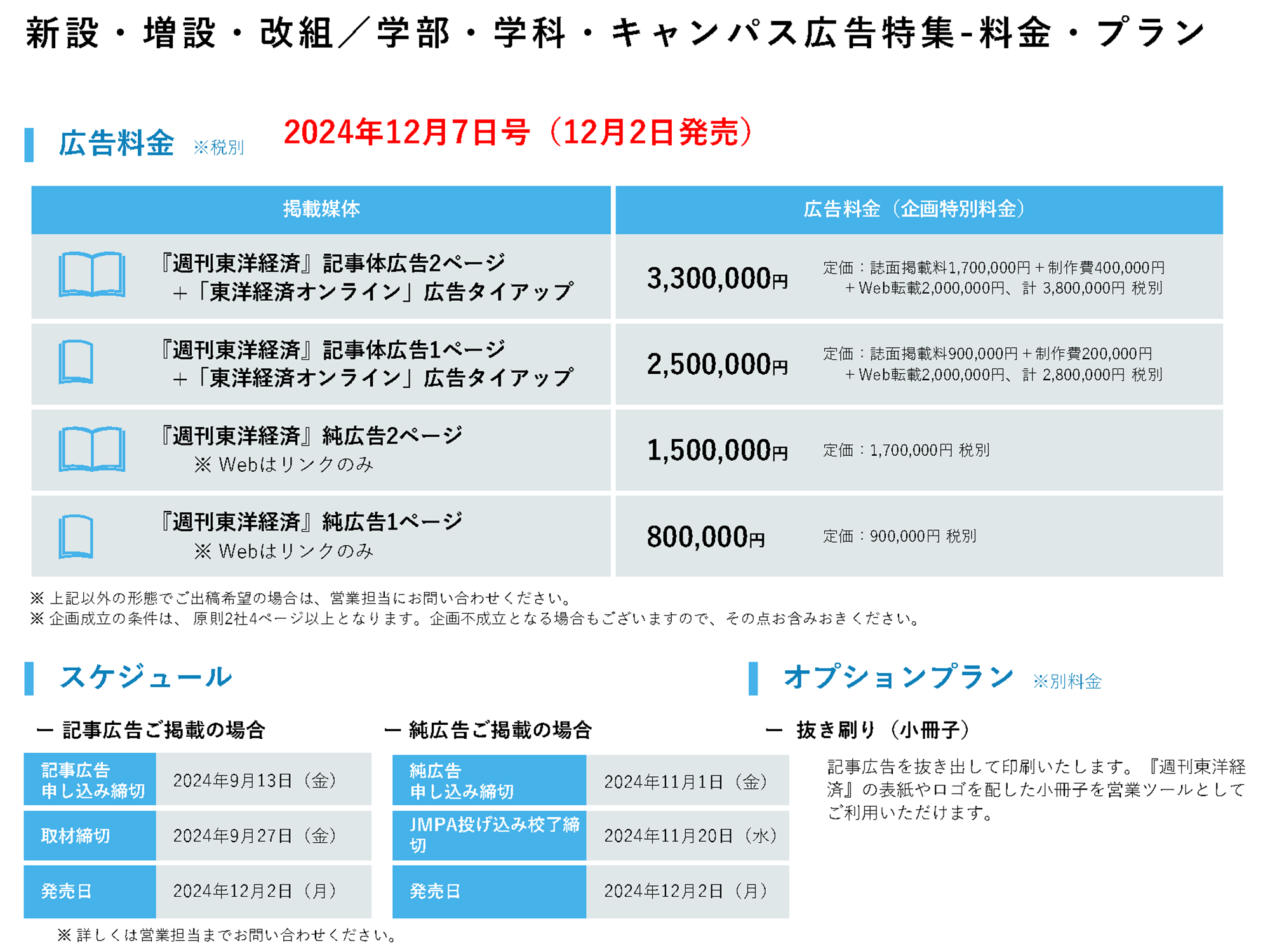 東洋経済新報社では、『週刊東洋経済』「東洋経済オンライン」を始めとした媒体で、豊富な大学広報の実績がございます。近年では媒体の枠にとらわれず、セミナーやカスタム出版など多彩なラインナップをそろえ、大学のニーズにそった展開を実現して参りました。