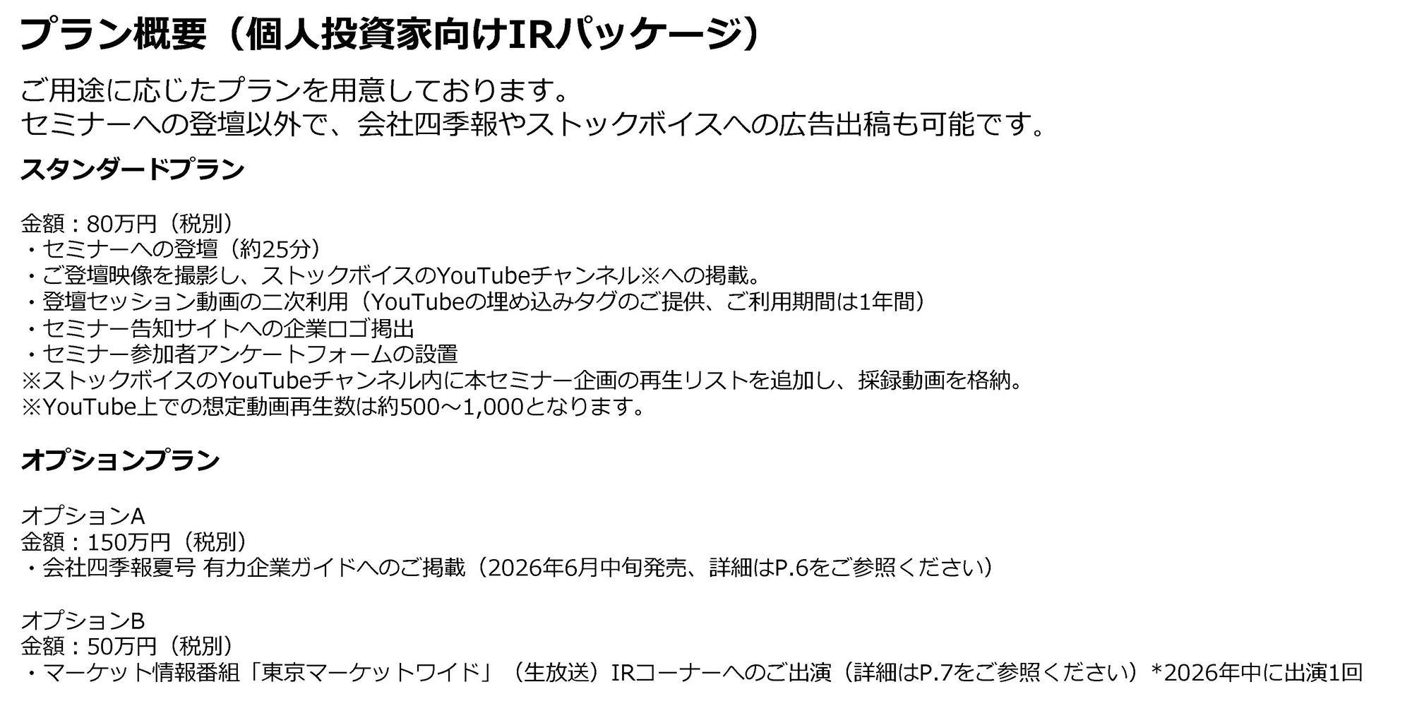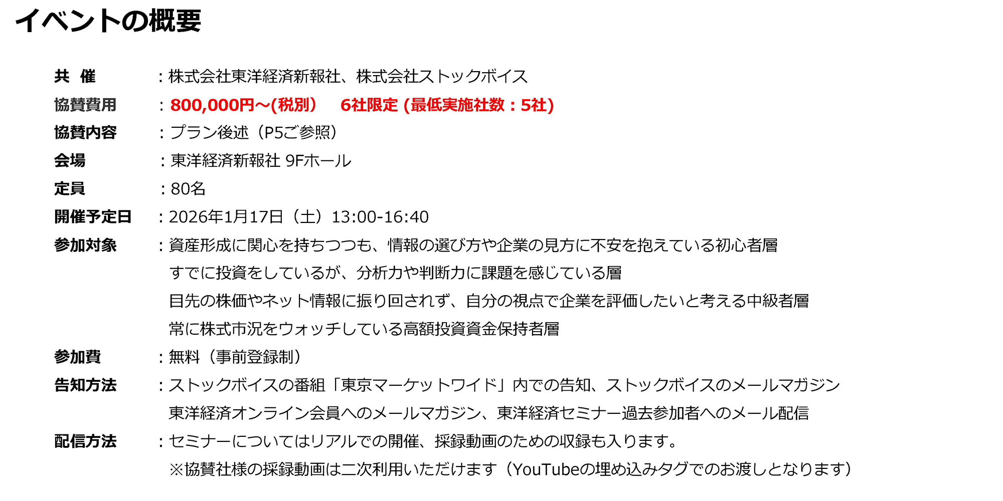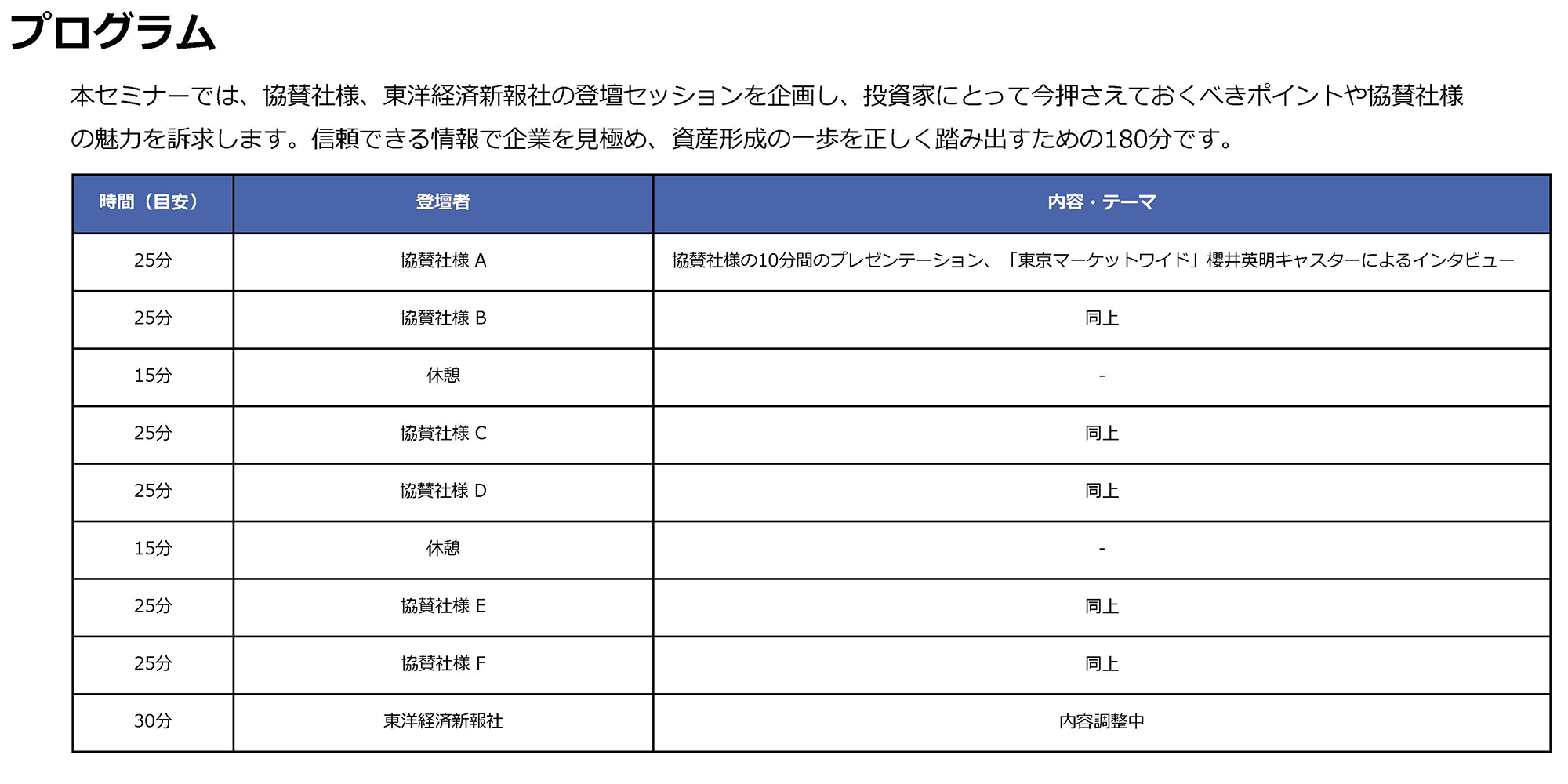 協賛社様の個人投資家に対するプレゼンテーションはもちろんですが、東洋経済やストックボイスの記者や出演陣による登壇、個人投資家にとって満足いただけるようなプログラムをトータルで検討しております。両社のファンである熱量の高い投資家に対してアピールできる場としては非常に有益なものであるはずです。
