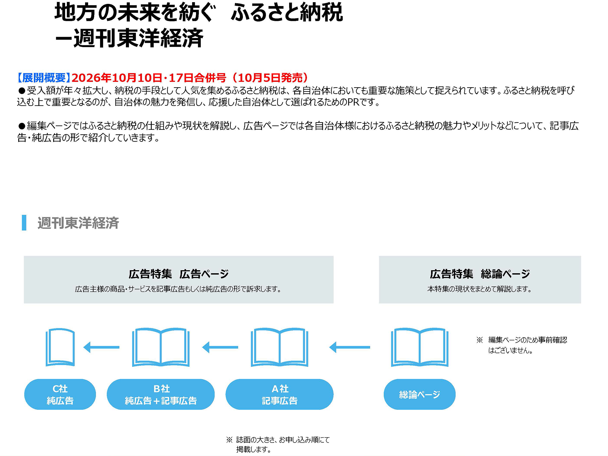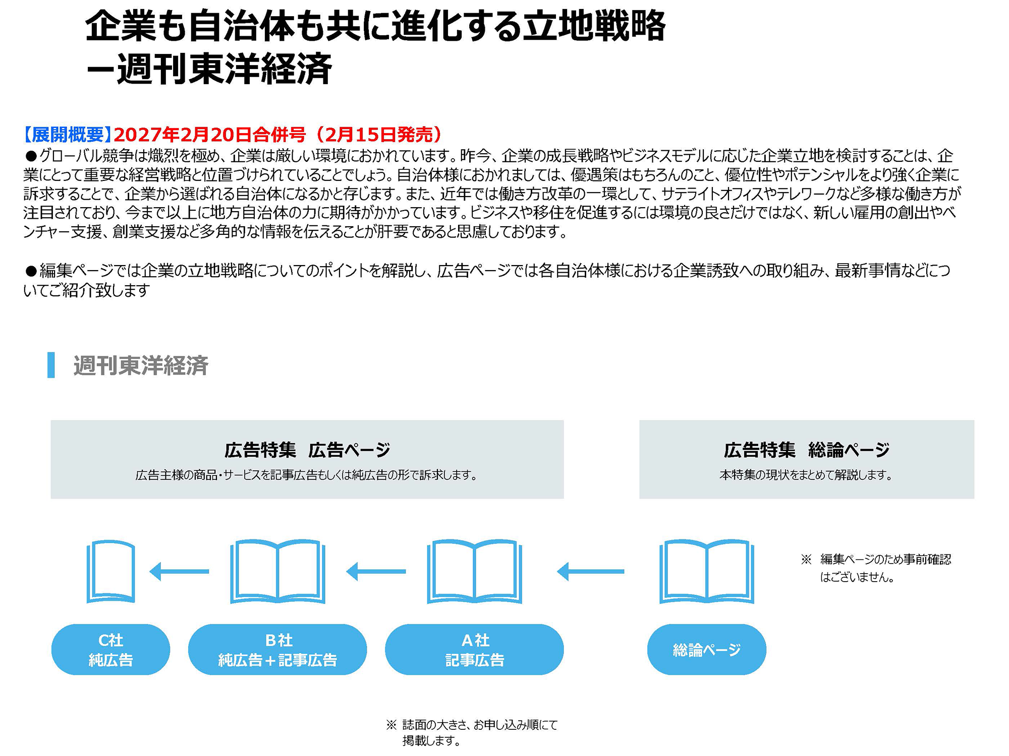 そこで東洋経済新報社では、自治体様の各種施策訴求、ブランディング向上を効果的に訴求できるPR展開としまして、弊社のリソースを活用した多様なラインナップをそろえました。 1988年にスタートして以来ご評価いただいている『週刊東洋経済』「企業誘致広告特集」を始め、 東洋経済オンライン(WEB)、セミナー、カスタム出版など、さまざまなご要望に対応できるメニューをそろえています。