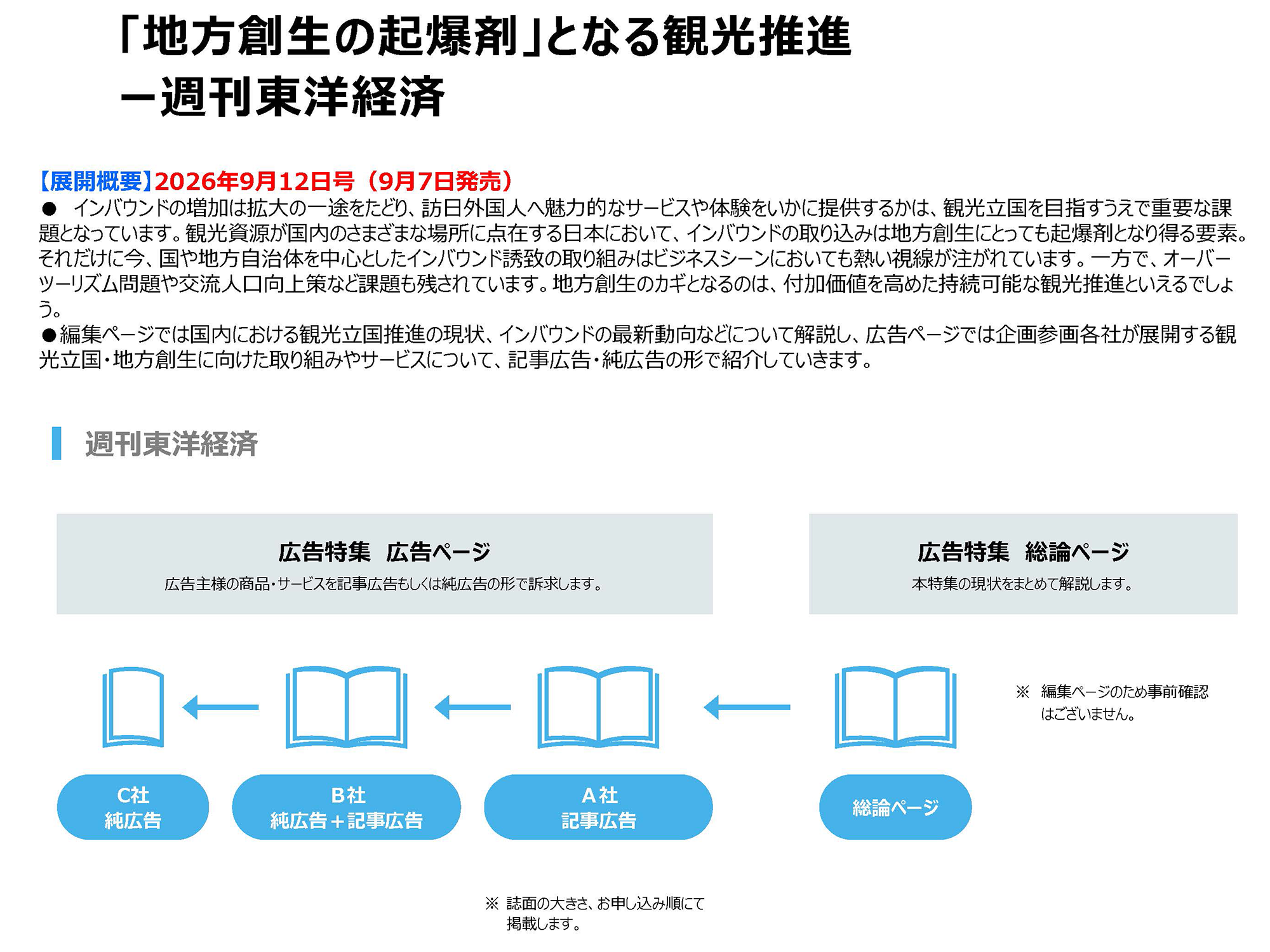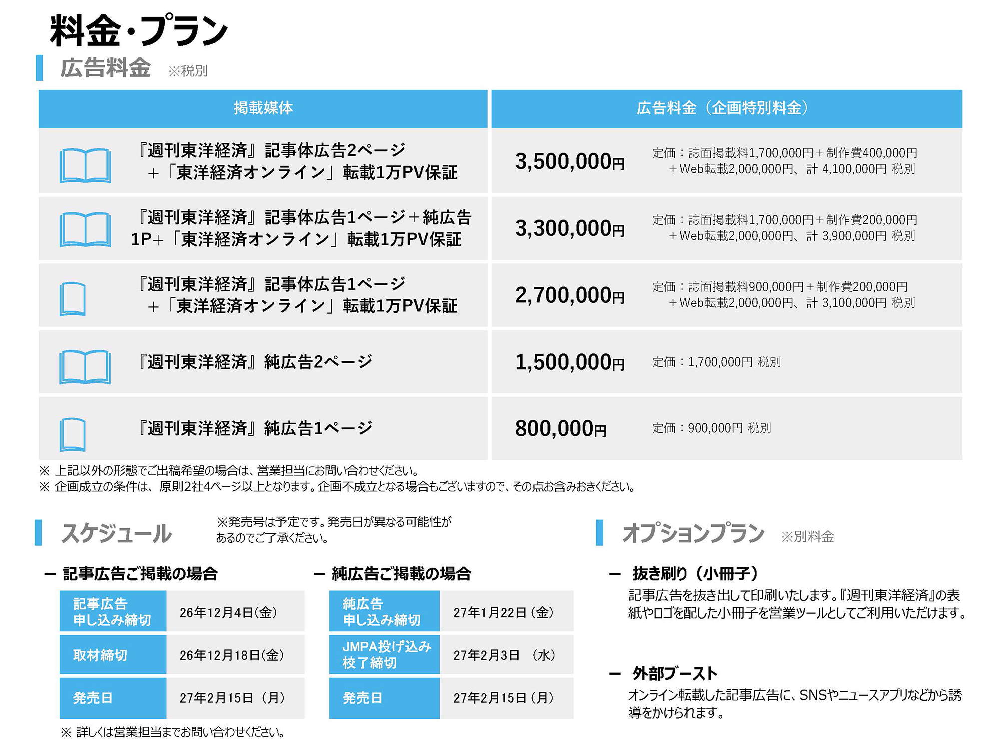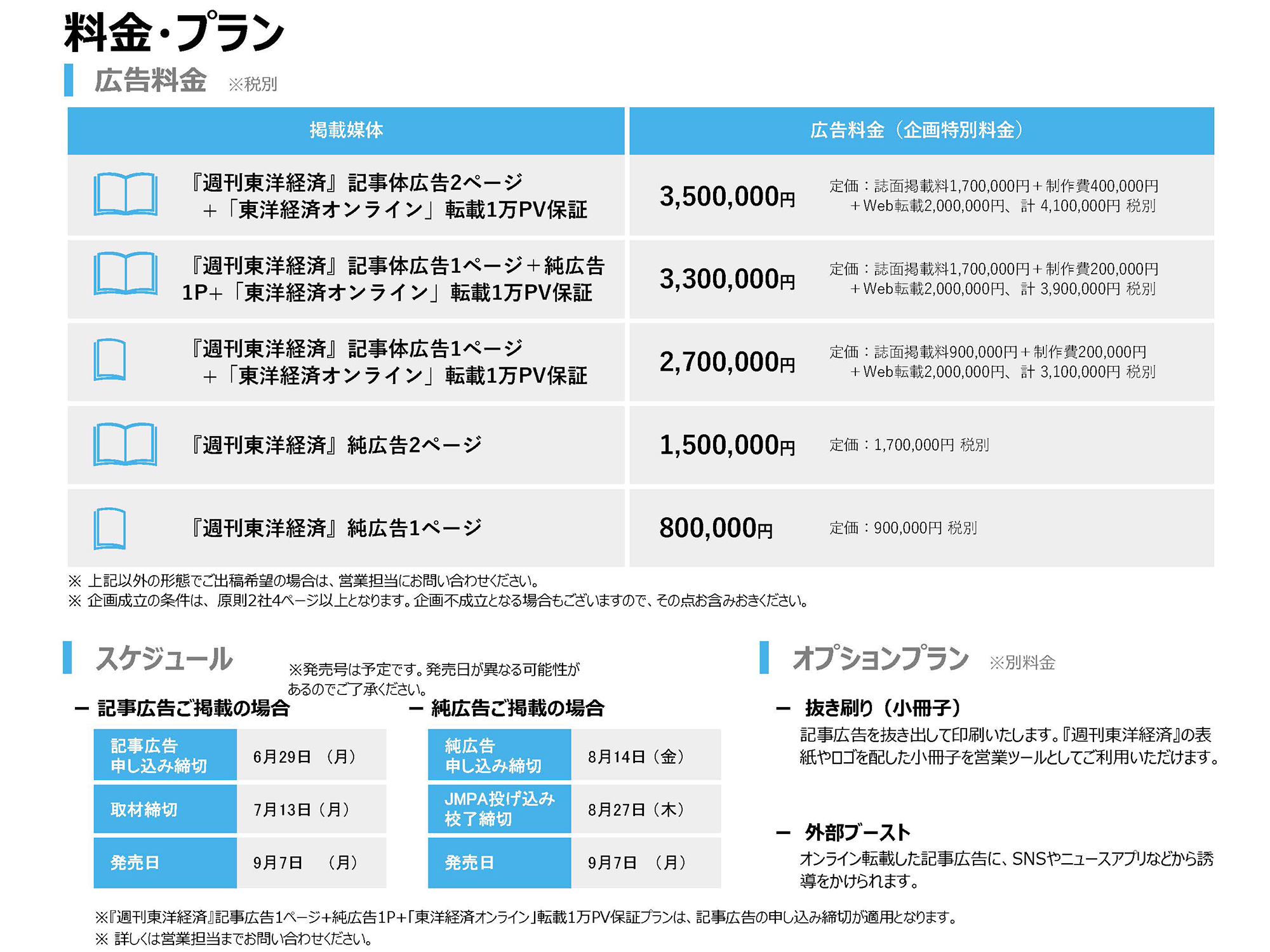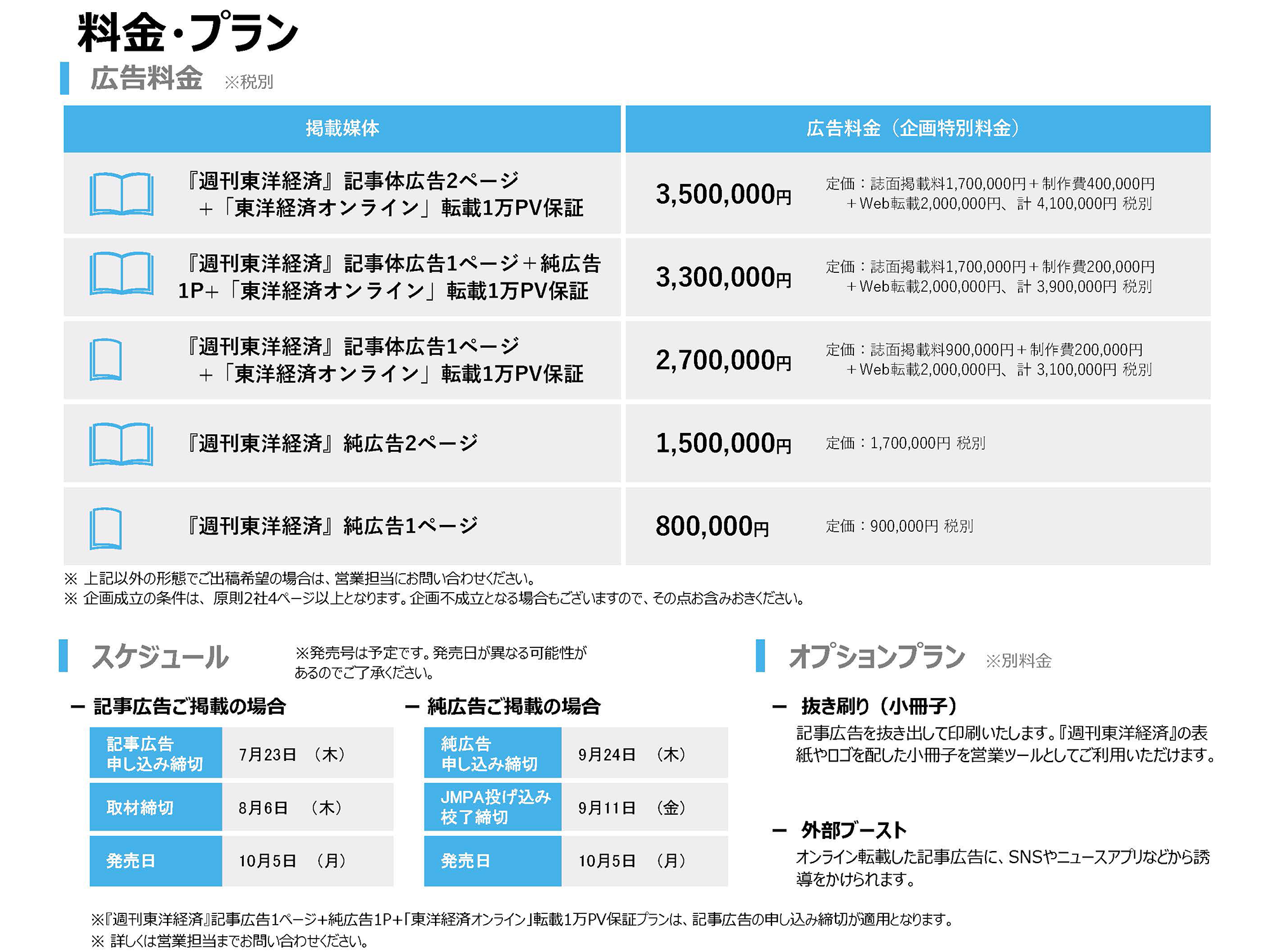 組織内において決定権を持つ企業・官公庁のトップおよびミドル層を中心読者とする『週刊東洋経済』、日本最大級のビジネス誌系サイト「東洋経済オンライン」の媒体特性を考慮すれば、ご展開の折にはコストパフォーマンスの高いPR効果が期待できるものと自負しております。