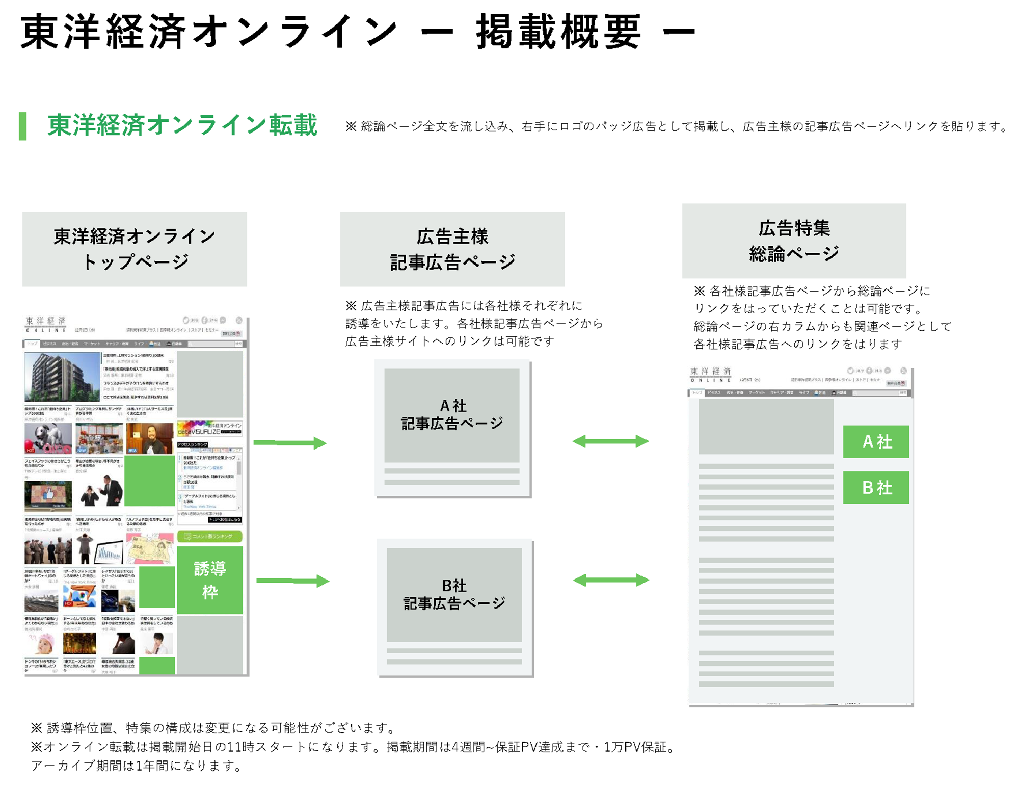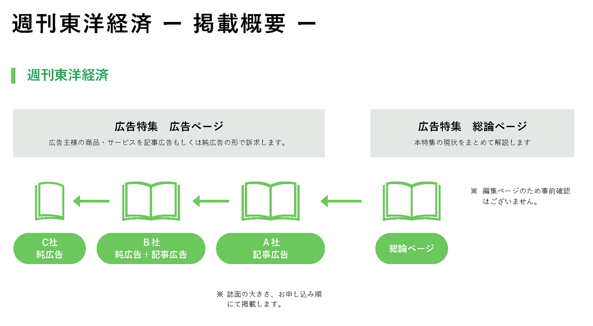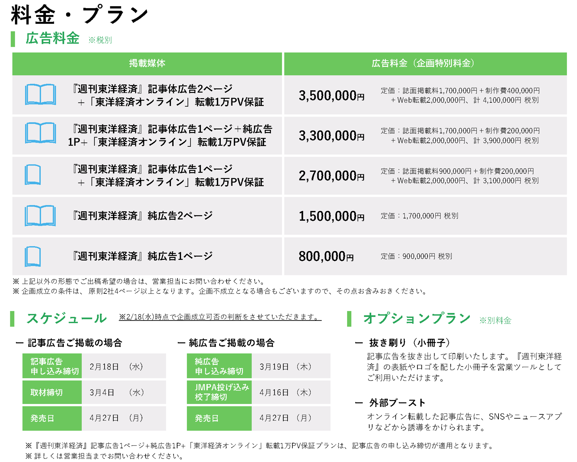 組織内の意思決定に大きな影響力と権限を行使しうるマネジメント層がメイン読者の『週刊東洋経済』、ビジネスの最前線に携わる読者が多く、ビジネス誌系サイトでトップクラスのアクセス数を誇る「東洋経済オンライン」によるクロスメディア展開で高い訴求効果が期待できます。こうした媒体特性を考慮すれば、コストパフォーマンスに優れた広告効果を発揮できるものと確信しております。PR戦略の一環として、本企画へのご参画をご検討いただければ幸いです。
