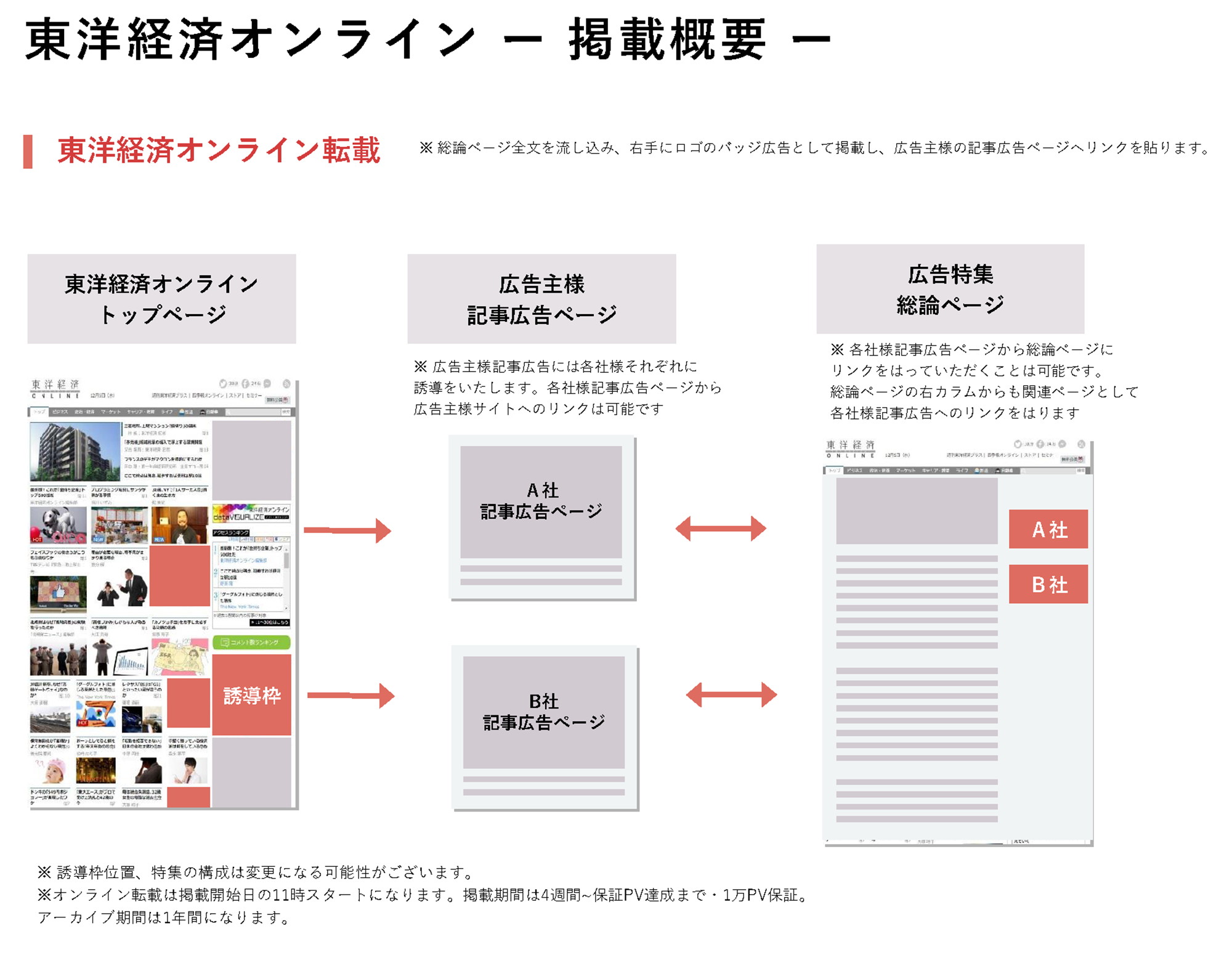そこで、『週刊東洋経済』2026年4月13日発売号ならびに「東洋経済オンライン」におきまして、「より良く生きるための、住まいづくり最前線」(仮題)と題したクロスメディア広告特集を企画いたしました。本特集では、より良く生きるための住まいづくりを解説する総論ページに続き、修繕、リフォーム、リノベーションなどをサービスとして提供する参画広告主様を、記事広告、純広告でご紹介させていただきます。また、『週刊東洋経済』誌面の内容を、「東洋経済オンライン」にも掲載することで貴社ソリューションをより幅広いビジネスパーソンに訴求することを目指してまいります。