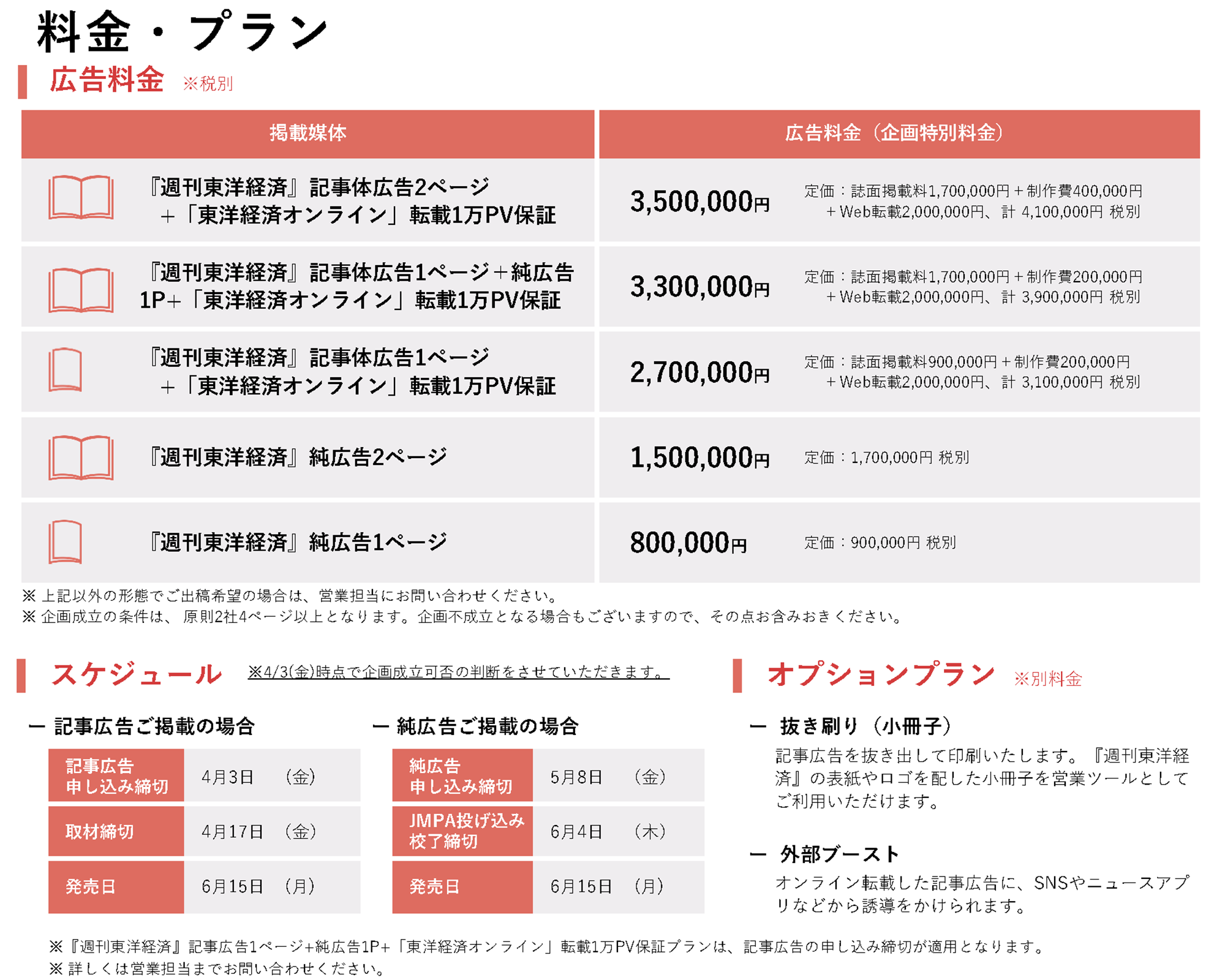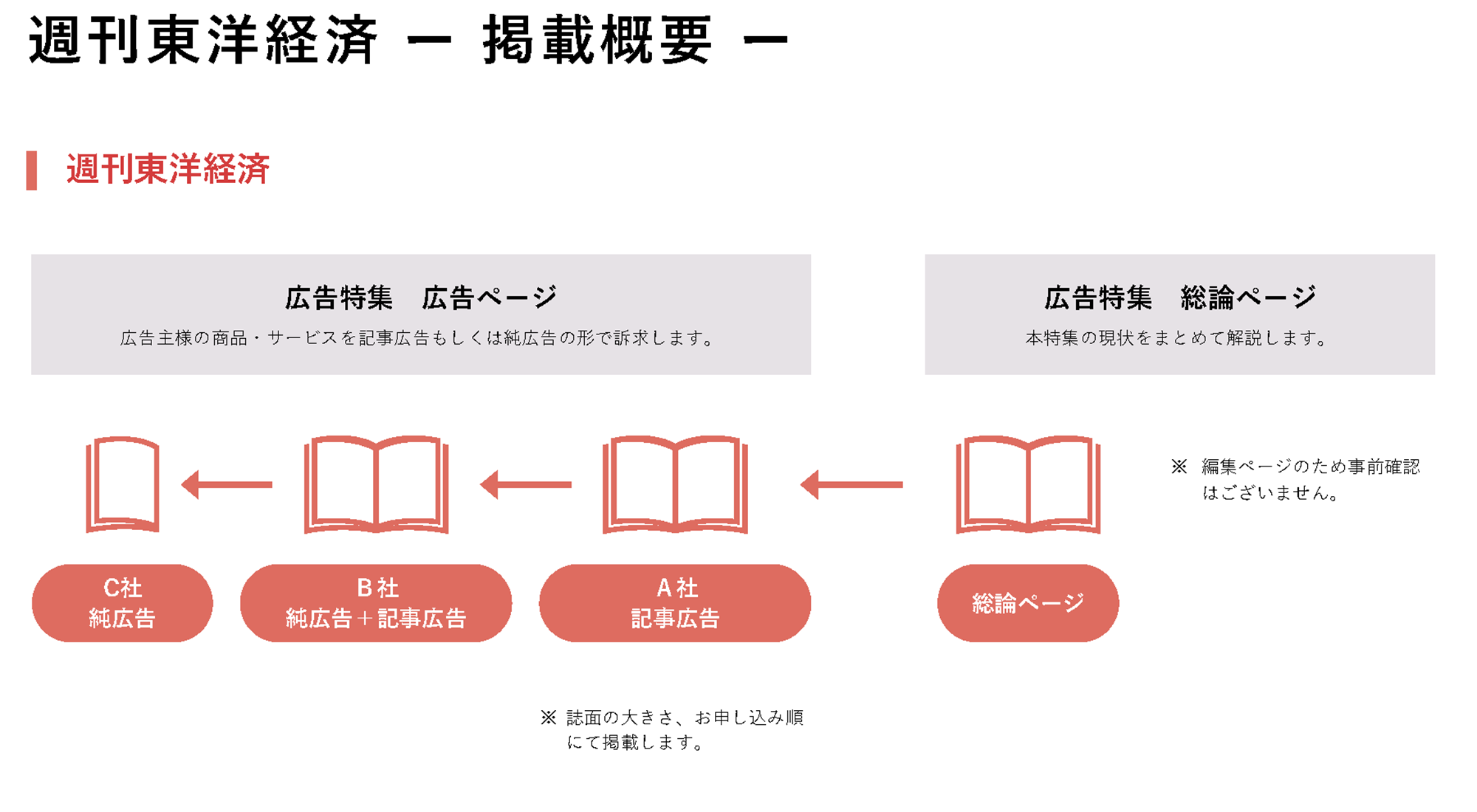 そこで2026年6月15日発売予定(6月20日・27日合併号)の『週刊東洋経済』では、広告特集「経営改善を実現する中小企業DX 2026(仮題)」を企画いたしました。本特集では、中小企業のDX推進における現状や課題、対策を解説する総論ページに続き、企画参画各社様が展開するサービス・ソリューションなどについて、記事広告・純広告の形で紹介していきます。